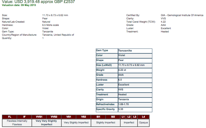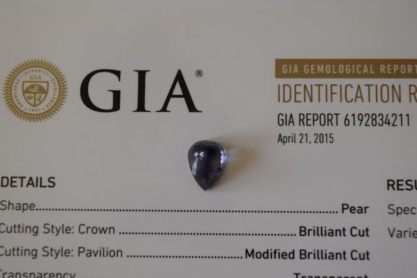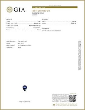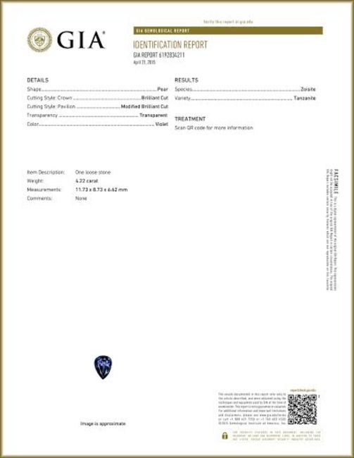4.22 ct GIA Certified 21st April 2015 100% Natural, Untreated, AAA Eye-catching Pear Cut (12 x 9 mm) Violet Tanzanite Gemstone. Certified by Gemological Institute Of America - GIA Renowned Gemological Institute in the World with head quarters in U.S.A and locations around the world. Gemval Average retail value trading index for April 2015, Results can be verified, www.gemval.com Gemstone variety: Tanzanite Weight: 4.22 cts. Color: 160 - medium violetish Blue; strong Clarity: VVS, Eye clean 1 Cut: Excellent Shape: Pear