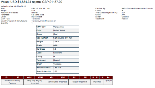 2.04 ct HKD of Canada Certified 24th March 2015. Bluish Violet Color Oval (10 x 7 mm) Genuine AAA Tanzanite Gemstone. Certified by Diamond Laboratories Canada - HKD International provider of diamond and gem stone reports, jewelry dossiers, and branded jewelry reports Gemval Average retail value trading index for April 2015, Results can be verified, www.gemval.com Gemstone variety: Tanzanite Weight: 2.04 cts. Color: 160 - medium violetish Blue; strong Clarity: IF - Internally Flawless Cut: Excellent Shape: Oval