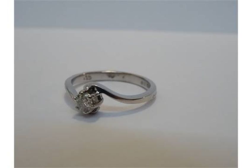 9 Carat White Gold Twist Style Solitaire Ring. Comrpising of 1 x 3.25mm round diamons. Approx 0.15ct. Comes with an independent insurance valuation of £300! Beautiful piece.