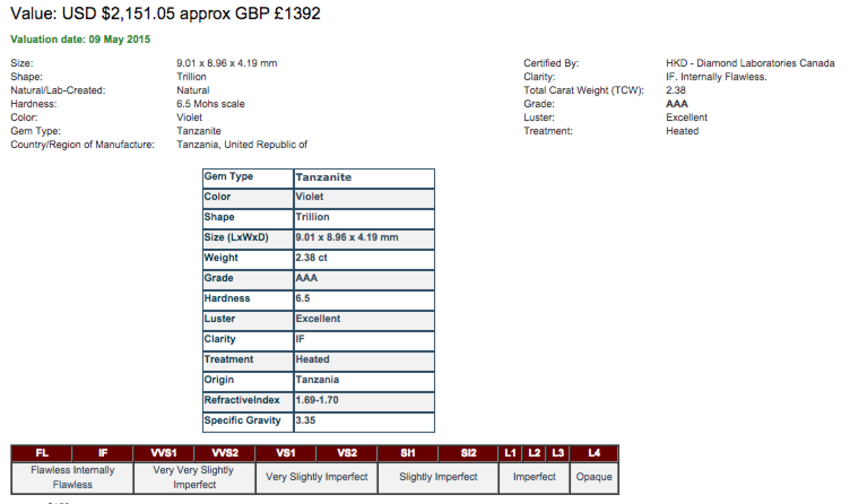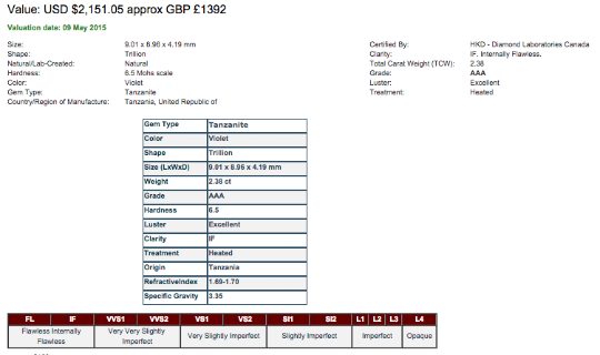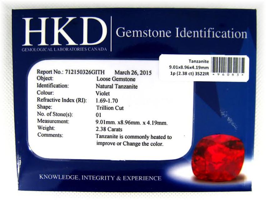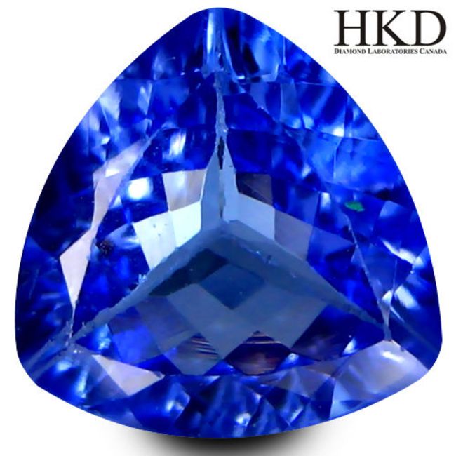 2.38 ct HKD of Canada Certified 26th March 2015, Marvelous Trillion Shape (9 x 9 mm) Violet AAA Tanzanite The Tanzanite Certified by Diamond Laboratories Canada - HKD International provider of diamond and gem stone reports, jewelry dossiers, and branded jewelry reports. Gemval Average retail value trading index for April 2015, Results can be verified, www.gemval.com Gemstone variety: Tanzanite Weight: 2.38 cts. Color: 160 - medium violet Blue; strong Clarity: VVS, Eye clean 1 Cut: Excellent Shape: Trillion