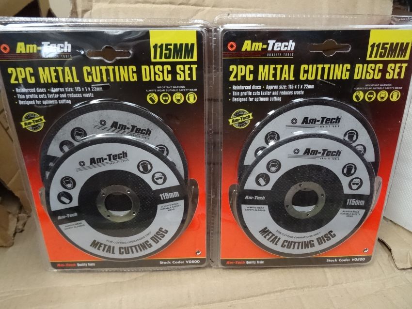 40 x Am-Tech Quality 2 Piece Metal Cutting Disk Set. 115MM Reinforced disks. Approx Size: 115 x 1 x 22mm. Thin Profile Cuts Faster and Reduces waste. Designed for optimum cutting! BRAND NEW and Packaged stock! RRP £9.99 per pack, total RRP Value £399.60! Great fast moving line!