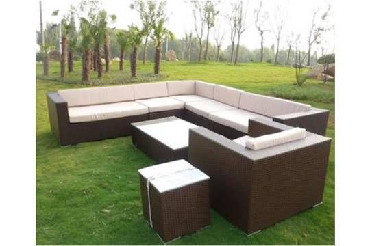 Brand New Executive 8 pc Contract Quality Corner Sofa Set with Coffee & Side table Brown PU All; Weather Rattan with Contrasting Beige Olifen Material with Deep Cushions Full Welded Aluminium Framework , Ready to use no assembly required  A Superb Corner Lounge Sofa Set that will Complement any Establishment Overall size of corner unit 3050mm x 3050mm 1 x left large corner unit 1400 x 900 x 640mm 1 x right large corner unit 1400 x 900 x 640mm 1 x single Arm Chair 900 x 900 x 640mm 2 x middle chairs 750 x 900 x 640mm  1 x corner unit 900 x 900 x 640mm 1 x large coffee table 1250 x 750 x 300mm 1 x side table 430 x 430 x 430mm      -    4 Boxes in total - box 1 = 1600 x 1100 x 800 = 60kg - box 2 =  1100 x 675 x 800 = 25kg - Box 3 = 1100 x 1000 x 1100 = 20kg - box 4 - 460 x 460 x 460 = 4kg.