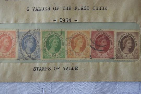 A collection of 6 Rhodesian & Nyasland stamps ( the envelope has been opened)