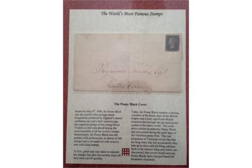 A very collectable Authenticated Penny Black Cover, Victorian post marked May 28th 1840, Gateshead, Addressed to Benjamin Jowlie Esq Hetton Colliery, comes in a folder with certificate of authenticity. The letter with the stamp attached is complete, comes in a folder with certificate of authenticity. The stamp has the letter H bottom left, L bottom right. The penny black was first issued 6th May 1840 so this stamp post marked 28th May is one of the first ever sent.