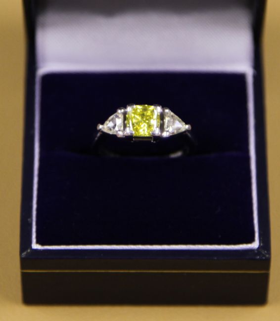 A 0.81 certified Cushion cut Yellow diamond, accomanied by a further two trillion cut diamonds set in 18 carat white gold.