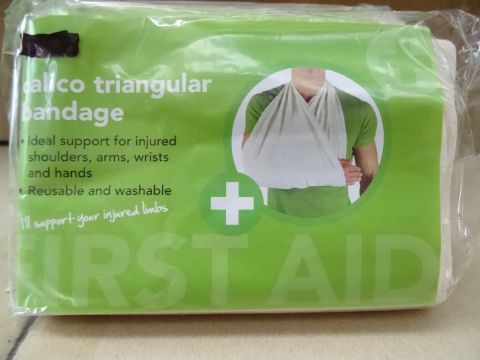 168 x Calico triangular bandges. Ideal support for injured shoulders, arms, wrists and hands. Reusable and washable. Brand new and Packaged. RRP £2.69 each, total RRP Value £451.92! Come in shop display boxes for ease of sale. Huge re-sale pottential!