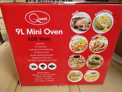 1 x Quest 9L Mini Oven 800 Watts. Auto Shut off, 9 litre capacity, quartz heating elements, tempered glass door. Cook Steaks, sausages, baked potatoes, lasagne, pizza, cakes, chips, burgers and more RRP £69.99! Brand new and boxed!