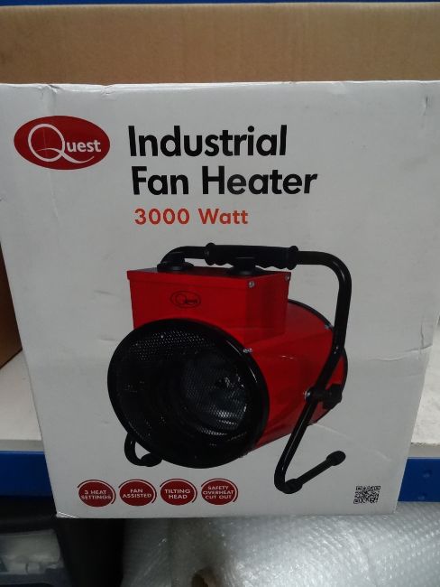 1 x Quest 3000 Watt Industrial Fan Heater. 3 Heat Settings, Fan assisted, Tilting Head, Safety Overheat cut out! RRP £119! Brand new and Boxed!
