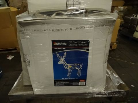1 x Pallet (R5) to contain 9 x The Christmas Workshop 3D Standing Moving Reindeers Clear Rope Lights. Approx. Size 110 x 54 x 108cm. 3m Lead Cable. Huge Retail Value. Unchecked/Untested boxed customer returns!