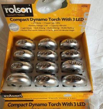 36 X Rolson 61704 3 LED Dyno Compact Torch - RRP £287.64 BRAND NEW – GREAT RE-SELLING OPPORTUNITY Lightweight and compact 3 Light settings 3 Bright LEDs Dynamo winding handle Supplied with wrist strap