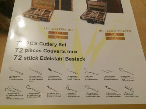 Royalty Line 72pc Stainless Steel- Satin Cutlery set in a briefcase_ Exclusive stainless steel & satin cutlery set_ Brand New RRP £825.00 Durable for everyday use but boasting the elegance needed for dinner parties. Washing machine washable. This lovely set will make a great present or be the talking point of your dinner parties.