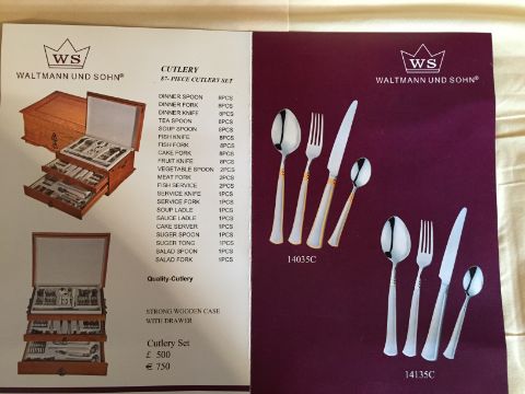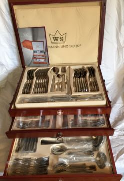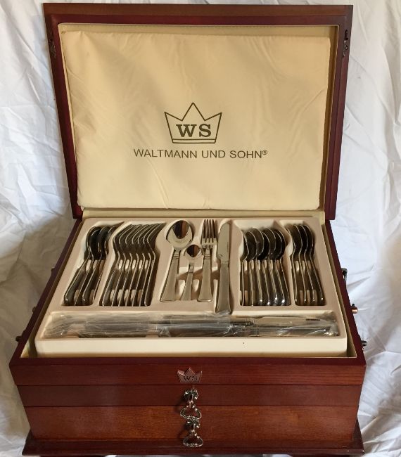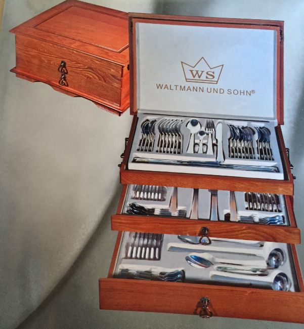 Waltmann & Sohn 87 Piece Dining Experience, Presented in a Lovely Oak Cabinet with 2 Draws – RRP £500.00 BRAND NEW COMPLETE SET This 87 piece comprehensive dining set comes with just about everything you need or would need for the complete dining experience. This satin finish stainless steel set comes well displayed in a purpose built oak two draw cabinet. This lovely well made set would grace the best of homes. • Complete and extensive dining cutlery set. • 87 Piece comprehensive set. • Stainless steel finish. • Display case with upper tray and two further draws. • Oak two draw cabinet.