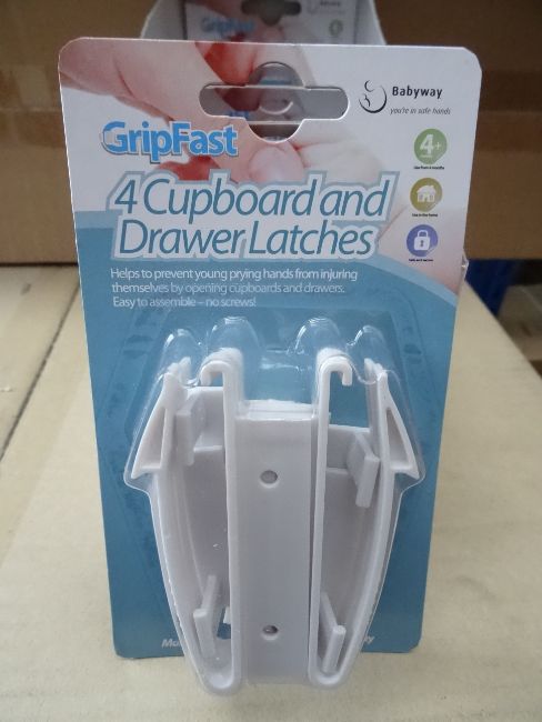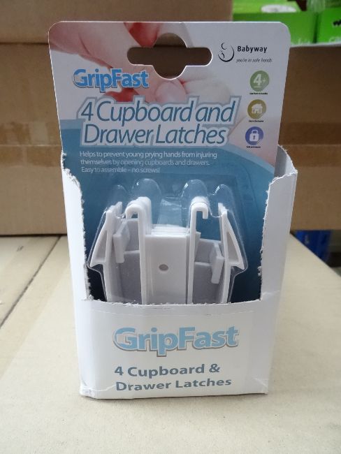 288 x Gripfast 4 Packs Cupboard and Drawer Latches. Helps to prevent young prying hands from injuring themselves by opening cupboards & drawers. Easy to assemble, no screws needed! Brand new and Packaged. RRP £5.29 each, total RRP Value £1,523.52! Come in shop display boxes for ease of sale. Huge re-sale pottential!!