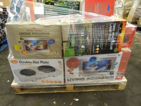 1 x Large Pallet (41) to contain 40 Boxed items to include: 2 in 1 vacuum, double hot platem living aquarium, candy floss maker, dunk the duck game, palma garden double glider seat, 2 tier barrel fountine, solar lights and much more BOXED Unchecked/Untested customer returned stock! Total Original Pallet RRP Value £1,402.97! Huge Profit Pottential!!