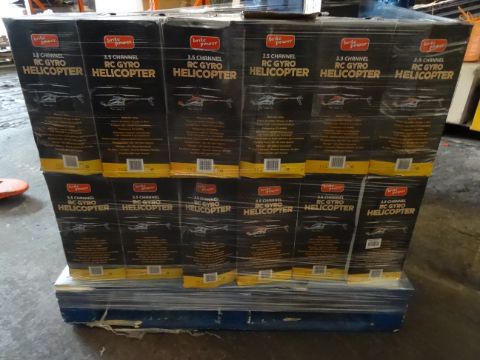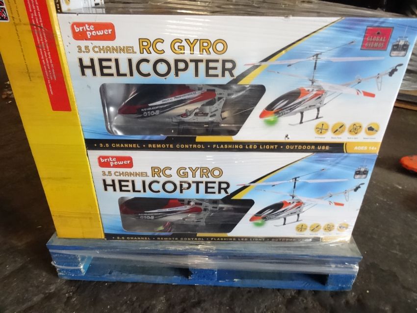1 x Large pallet (1) to contain 17 x Brite Power Mega Remote Control Gyro Copters. Size: 72 x 10.5 x 28cm. 3.5 channel. Material: Alloy. Fly Distance: 40-80m. Original RRP Value £99.99 each, total rrp value £1,699.83! Unchecked/Untested boxed customer returns! Huge Profit Pottential!