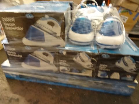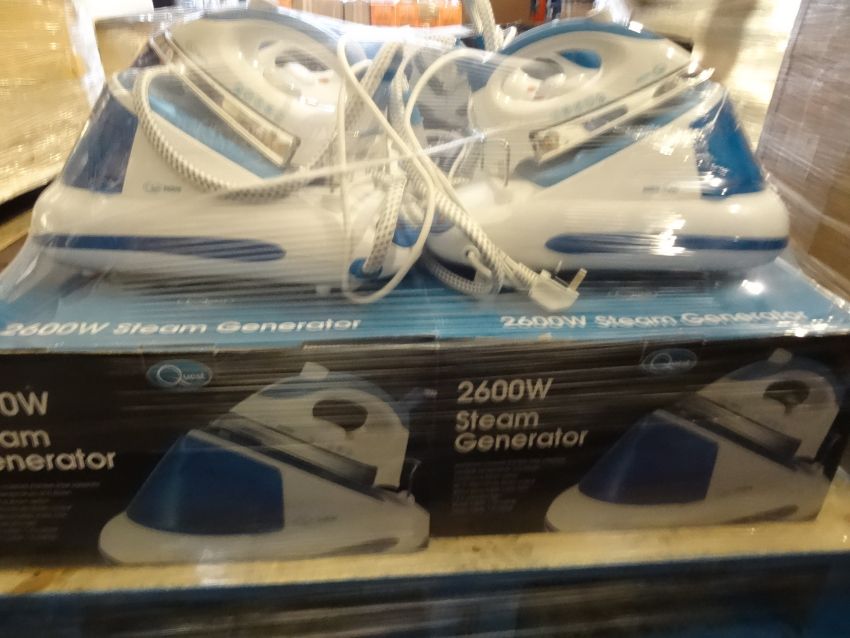 1 x Large Pallet (14) to contain 14 x Quest 2600w Steam Generating Irons. Aluminium covered soleplate, variable temp and steam, continuous steam option, LED indicator light, 800ml detachable water tank. High quality. Very high retail value! Huge Profit Potential! Unchecked/Untested Customer returns! Includes 10 x Boxed, 4 x Unboxed.