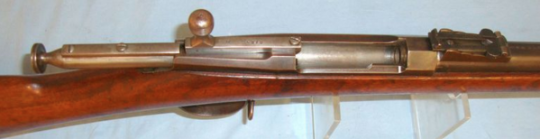 The Berdan rifle is a Russian rifle created by famous American firearms expert and inventor Hiram Berdan in 1868. Berdam rifles were standard issue in the Russian Army from 1870 to 1891. The model of 1870, or Berdan II, is a single shot bolt action with a distinctive short, pear-shaped, bolt handle. The bolt handle serves as the only locking lug for the action, and when closed, points upwards at a 30 degree angle, rather than horizontally. The Berdan II Infantry rifles were issued with quadrangular socket bayonets.