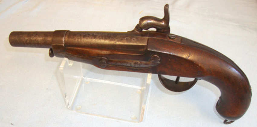 This is an original Victorian era Percussion Pistol in the form used by the French Gendarmarie. It is 13 ½” in length overall with a 7 ¼” barrel which is .650" carbine bore. The woodwork is a nice deep brown. The wood has a very small impressed 'NB' mark. The metal work has light staining consistent with age.