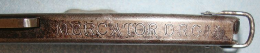 The 2 additional folding tools (illustrated) fold securely into the steel handle. The back of the handle is crisply marked 'MERCATOR DRGM'.