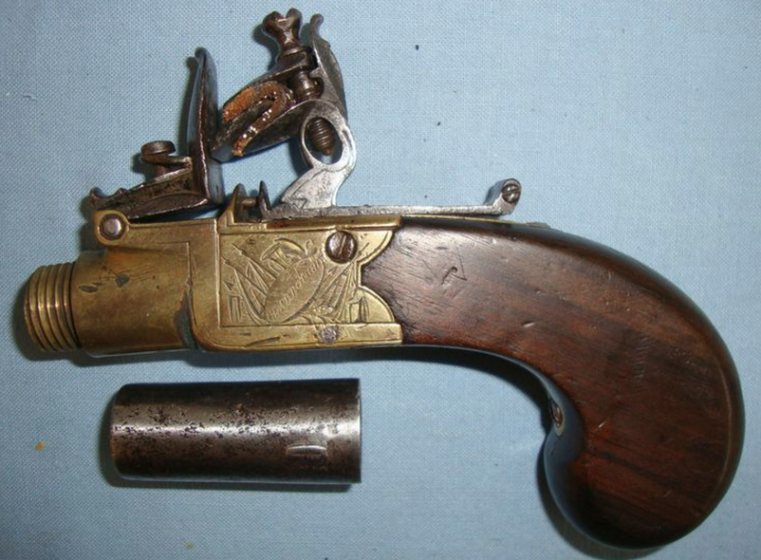 English, Brass Framed Flintlock Pocket Pistol With Screw Off Barrel By Clabrough Of Lincoln & Birmingham