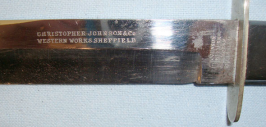 The blade is also marked 'Christopher Johnson & Co Western Works Sheffield'. It's original brown leather sheath with German Silver Throat mount and chape has an integral belt loop to the rear.