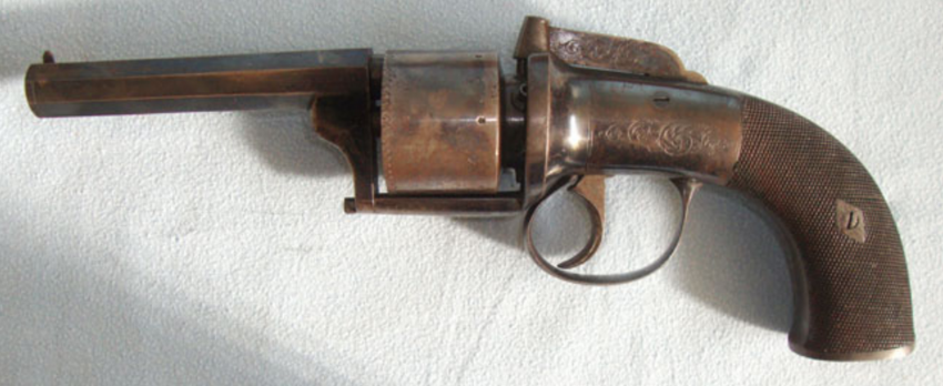 The pistol retains its original finish. Although there are no manufacturer or patent markings on this revolver it is no doubt a transitional Laird’s Patent piece (J. W. Laird, Gunmaker listed in the 1849 Birmingham Gunmakers Register at 10 Steelhouse Lane Birmingham).