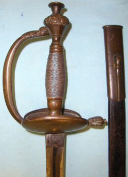 A fine quality Model 1796 Prussian Infantry Officers Sword in its original scabbard. This is one of a pair of absolute original sleepers not offered for sale previously. Very similar to its contemporary British counterpart this is a rare sword. Solid brass handle, pommel, knucklebow, quillon and 2 kidney shaped shells.