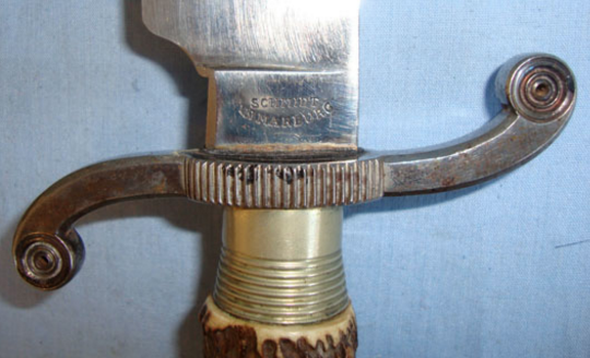 It's 11" single edged blade with Bowie type swept top edge is excellent. It measures 16" overall. It has a swept cross guard with German Silver ferrule. The blade is crisply marked with manufacturer detail 'Schmidt In Marburg'. The weapon is complete with brown leather scabbard with brass mounts. The upper mount has an acorn shaped locket stud.