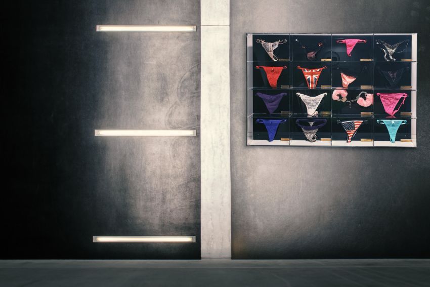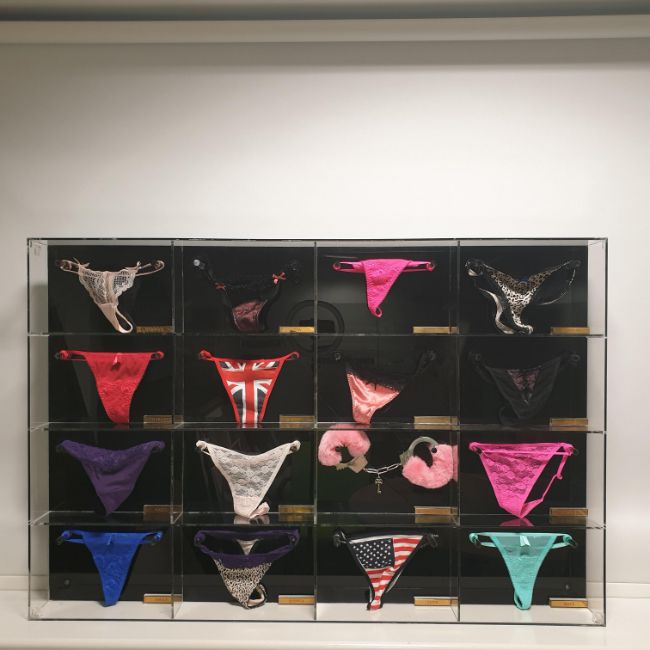 Trophy Cabinet,' perspex cabinet with lingerie and metal labels