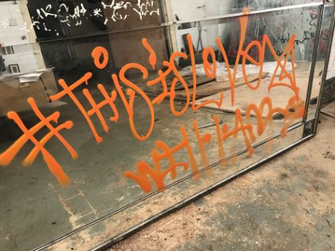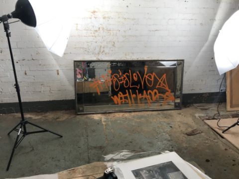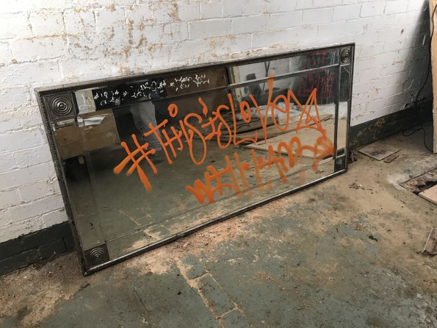 Will.I.Am Artist from the Black Eyed Peas ‘This is Love Mirror’ A silver bevelled edged mirror with orange spray paint inscription