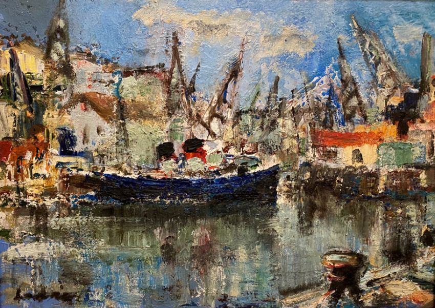 At Harbour signed oil by Hamish Lawrie, Scottish 1919 – 1987
