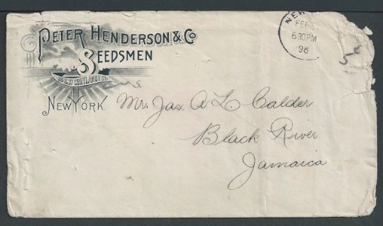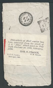 Cover from New York (Feb. 2-) to Jamaica, the stamp washed off and a "P.D."handstamp applied, the reverse bearing the explanatory label "This article of Mail matter has / been recovered from the wreck of / S.S. "Ailsa" which sunk in New / York Harbour on 29th February, / 1896./ GEO. H. PEARCE, / P.M. Jamaica.