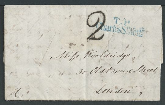 The letter was carried to London by diplomatic bag and posted as an inland letter, with blue "T.P / Charles St westr" and a "2" charge mark.