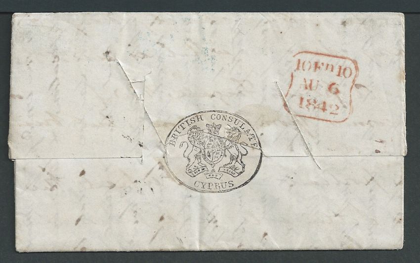 Entire letter written by a member of the British Consulate staff at Larnaca, the reverse sealed by a printed wafer seal "BRITISH CONSULATE / CYPRUS", disinfected with a 1 inch and two 1.1/4 inch chisel slits.