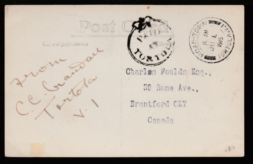 The address side of the card has a similar datestamp of June 1st and, in the identical black ink, a fine strike of the uncommon Crowned Circle "PAID / AT / TORTOLA". This Crowned Circle was resurrected in about 1914 and used very occasionally at Road Town to confirm payment by stamps on the reverse of an item.