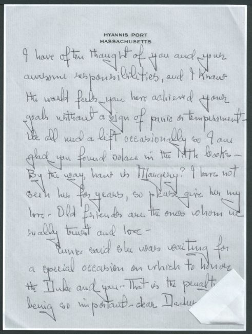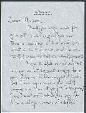 Autograph letter from Mrs. Rose Kennedy (1890-1995) to the Duchess of Windsor in Paris, with original envelope from Hyannis Port, Mass.