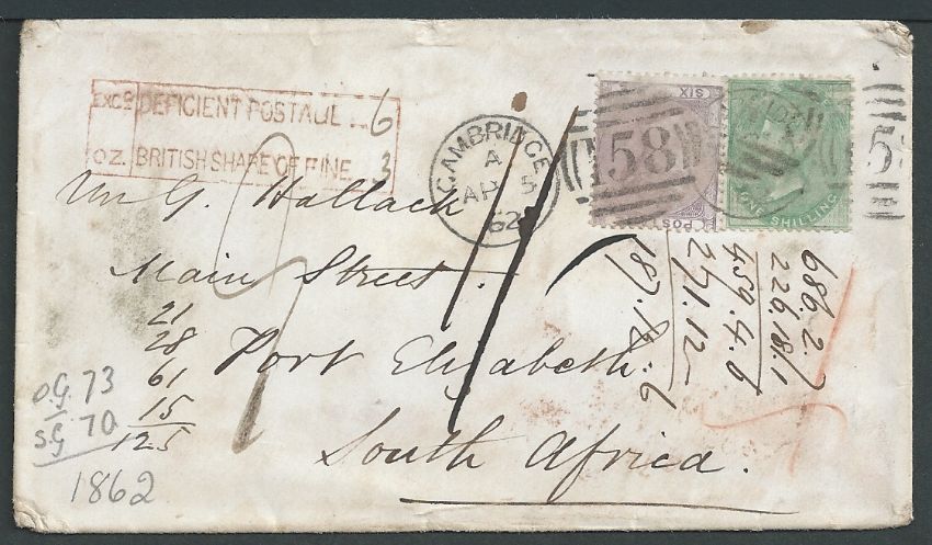 GB - Postage Dues 1862 Cover from Cambridge and addressed to Port Elizabeth