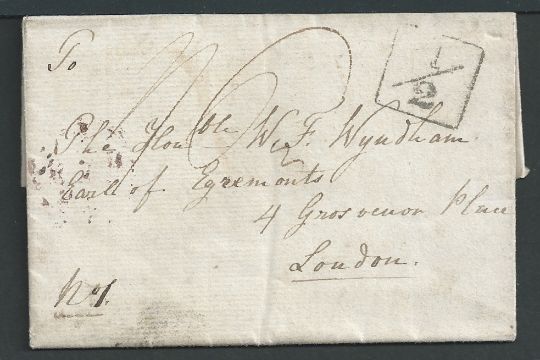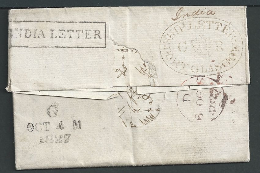 Entire letter (hole caused by removal of seal on reverse) to London backstamped by the oval "SHIP LETTER / G (crown) R / PORT GLASGOW" (Robertson S6) with "India" in manuscript above.