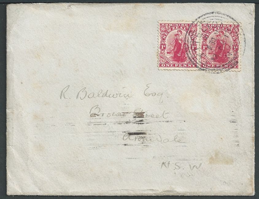 Antarctic 1913 (Feb 12) Cover with "BRITISH ANTARCTIC EXPEDITION / TERRA NOVA R.Y.S."crest printed on the flap, posted from Lyttelton to New South Wales, franked by two 1d stamps. The "Terra Nova" sailed from the Antarctic for the final time on January 26th, arriving back at Lyttelton on the day this cover was posted.