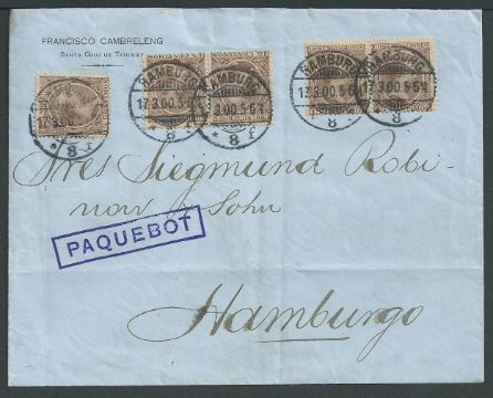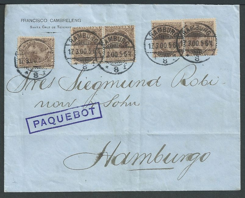 Cover (light folds) from Santa Cruz de Teneriffe to Germany bearing five Spain 5c stamps each cancelled by Hamburg datestamps, handstamped violet boxed "PAQUEBOT" (Hosking 867, first recorded year of use). An attractive Paquebot cover.