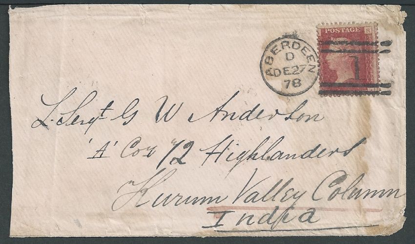Afghanistan / G.B. Military 1878 Cover (some staining) from Aberdeen to a soldier with the Kurrum Valley Column in Afghanistan, franked by a 1d red, paying the 1d soldiers concession rate, backstamped at Kohat and Allahabad.