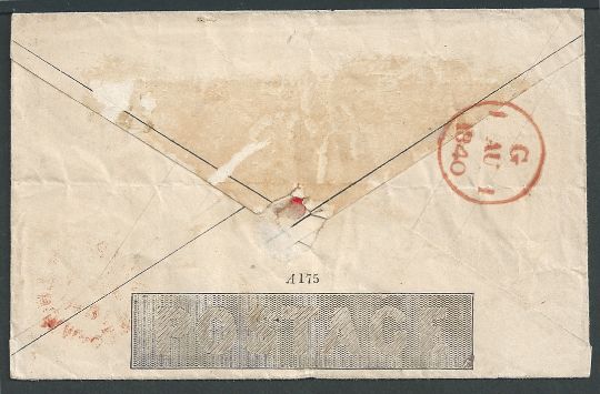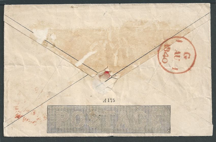 1d Mulready envelope (horizontal file fold, staining to flap) stereo A175 posted from Newport to Farringdon, cancelled by a red Maltese Cross with a Newport datestamp on the front.