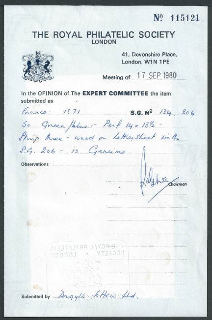 Entire to Naples, franked by Third Republic 1871, a horizontal strip of three 5c green/blue, S.G. No. 134, used together with single S.G. 206.With Royal Certificate of Genuineness No, 115121.A beautiful item.