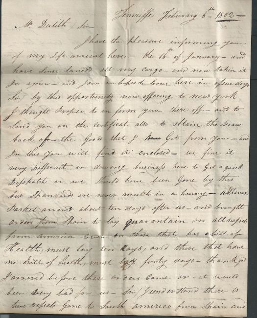 Spain/Canary Islands/U.S.A. 1802 (February 6) Entire Letter from Captain Thomas Wills