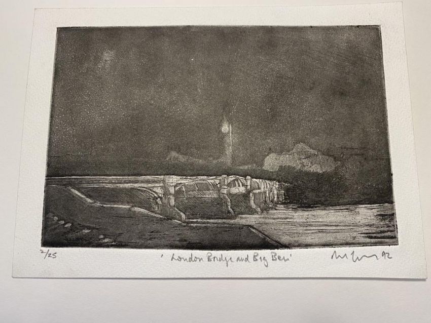 David Gunning, Dave Gunning Limited Edition Etching London Bridge And Big Ben 92.London Bridge & Big Ben Limited edition etching #2/25 Signed Size 185 x 260mm