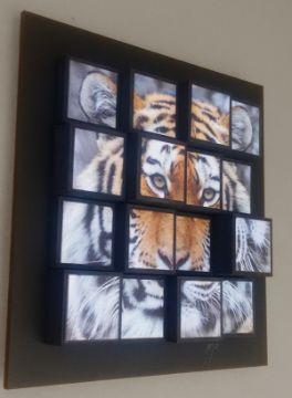Photos are printed on canvas, precisely cut, and assembled on wooden cubes.