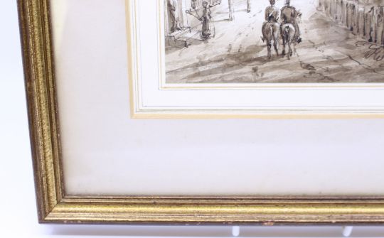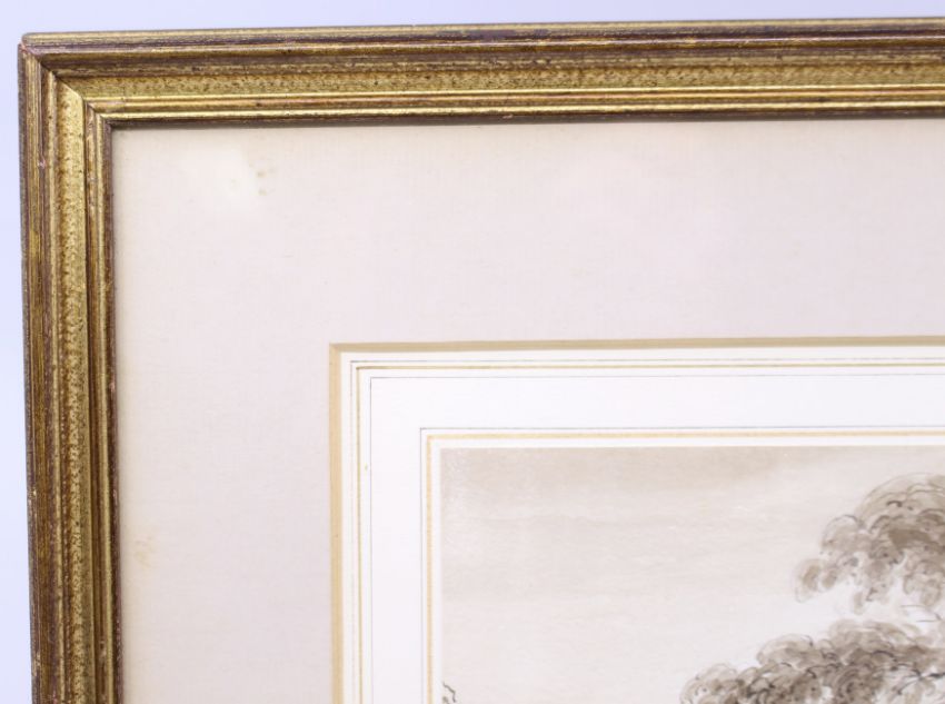 Sepia Watercolour Corfe Castle by Cecilia Montgomery (1792-1879) Title Two soldiers riding towards Corfe Castle, c.1828, 7 x 8 1/4 inches Artist Cecilia Montgomery (1792-1879) Medium Brown wash, pen & brown ink Frame Mounted and set behind glass in gilt frame Frame size 35 x 39.5 cm / 13 3/4 x 15 1/2 in Condition Picture in very good condition commensurate with age.