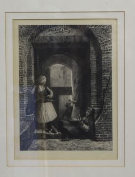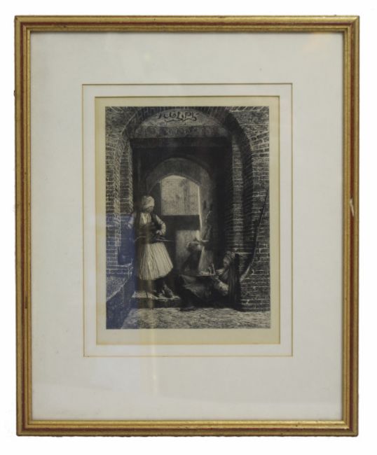 Victorian Arabic Etching Set in Gilt Frame Etching of gentleman in doorway, Arabic writing above.