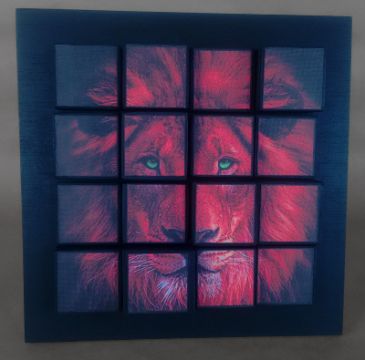 Photos are printed on canvas, precisely cut, and assembled on wooden cubes.