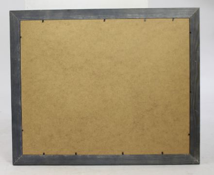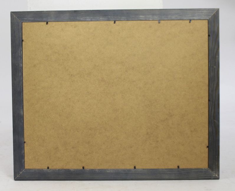 Mounted & set behind non-reflective glass in painted wooden frame.